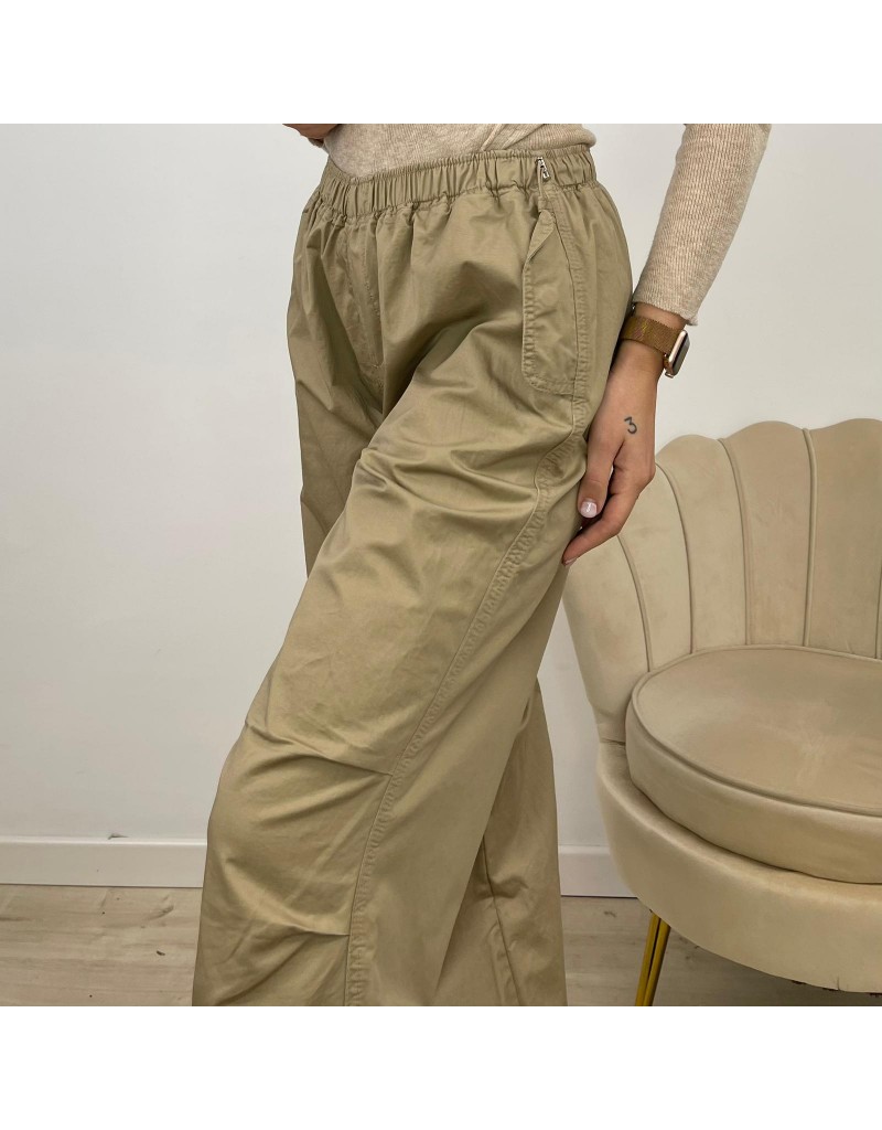 Pantalone modello cargo, con elastico in vita, e patte laterali oblique.