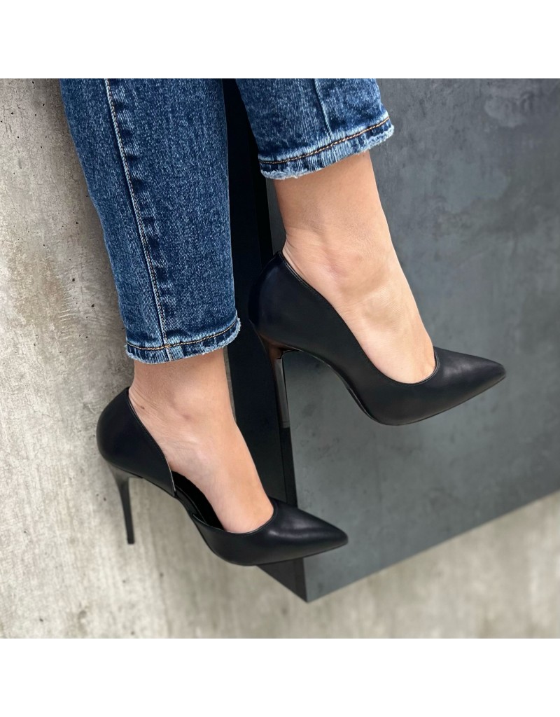Décolleté in ecopelle con punta affusolata, tomaia intagliata lateralmente e tacco 10 cm tono su tono.