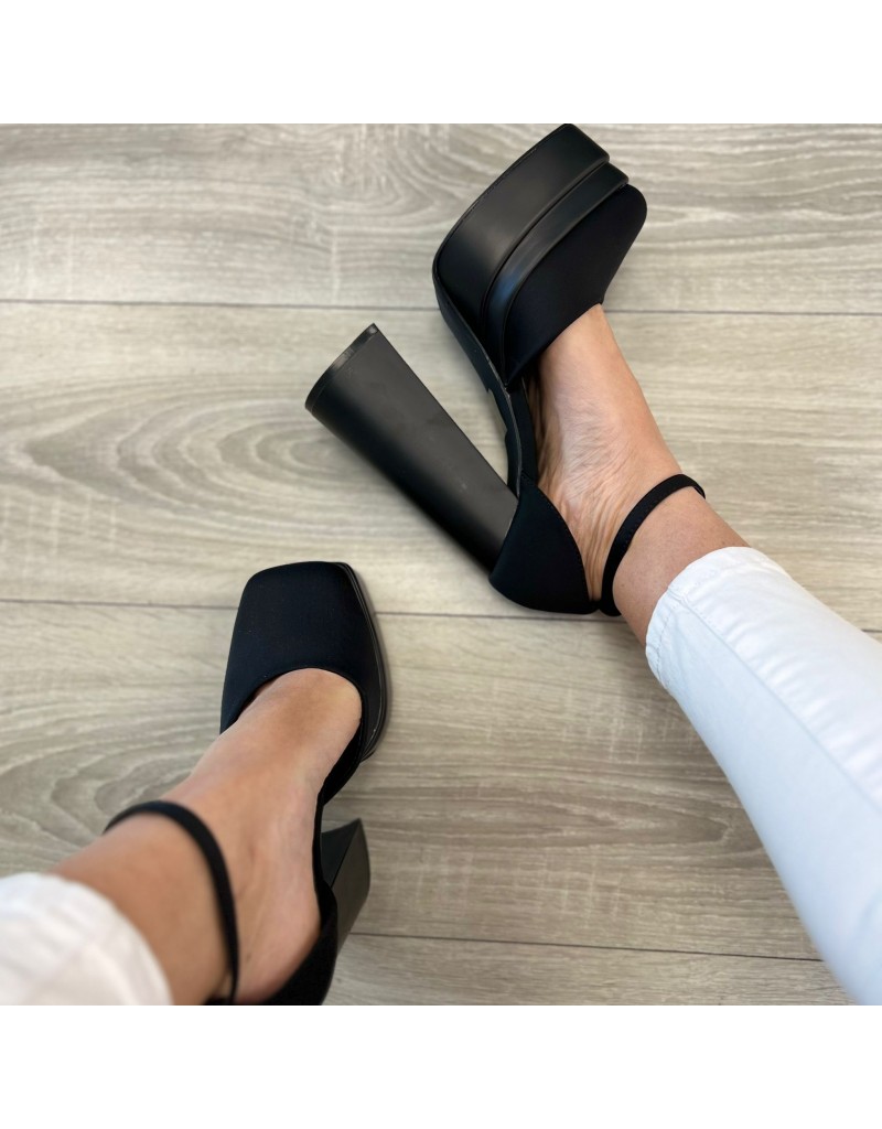 Décolléte con punta squadrata , cavigiera, maxi plateau e tacco doppio.
