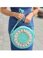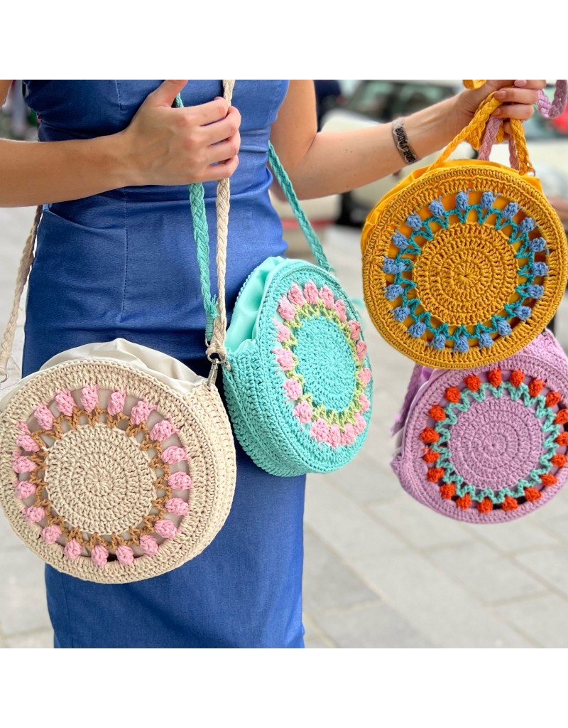 Borsa uncinetto, rotonda, con tracolla intrecciata.