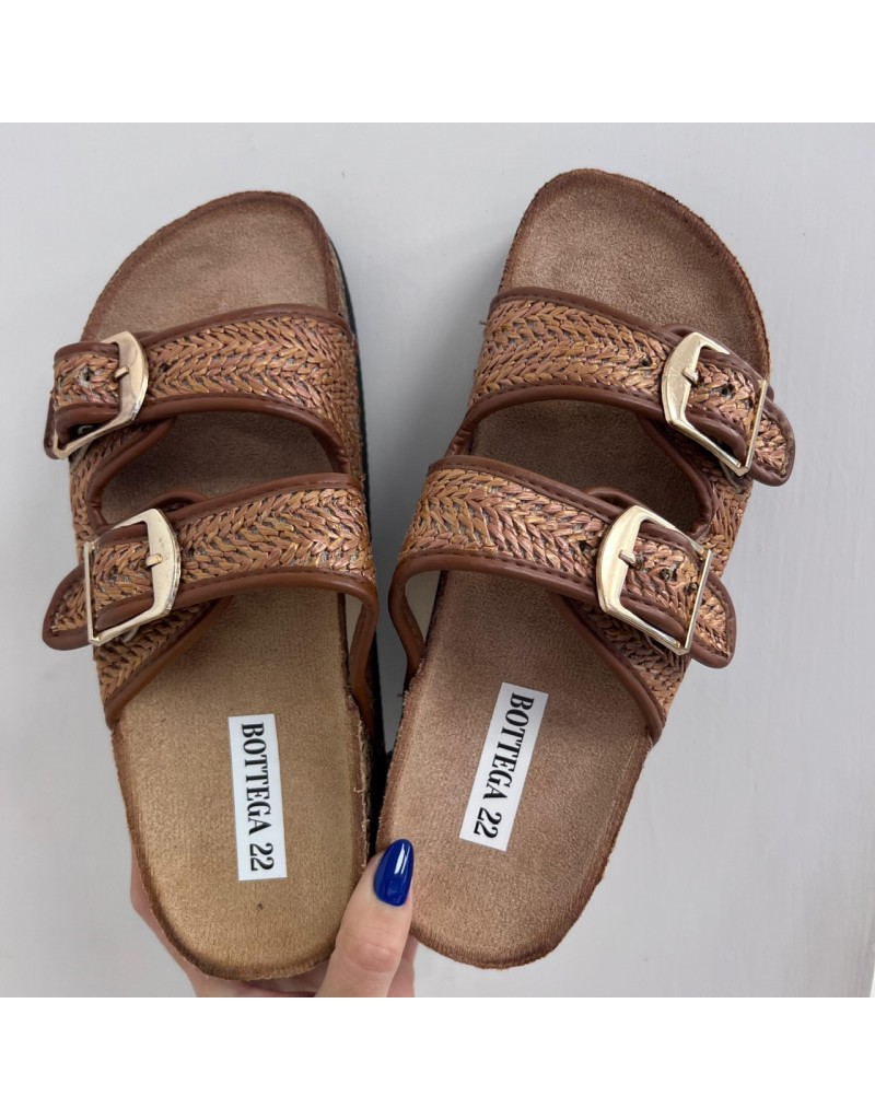 Ciabatte con fibbiette in tessuto ecopelle intrecciato.