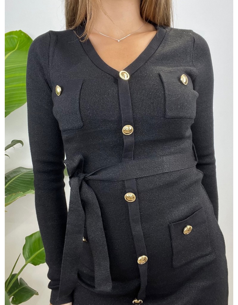 Dress in lanetta rasata laminata con bottoni e taschini.