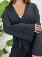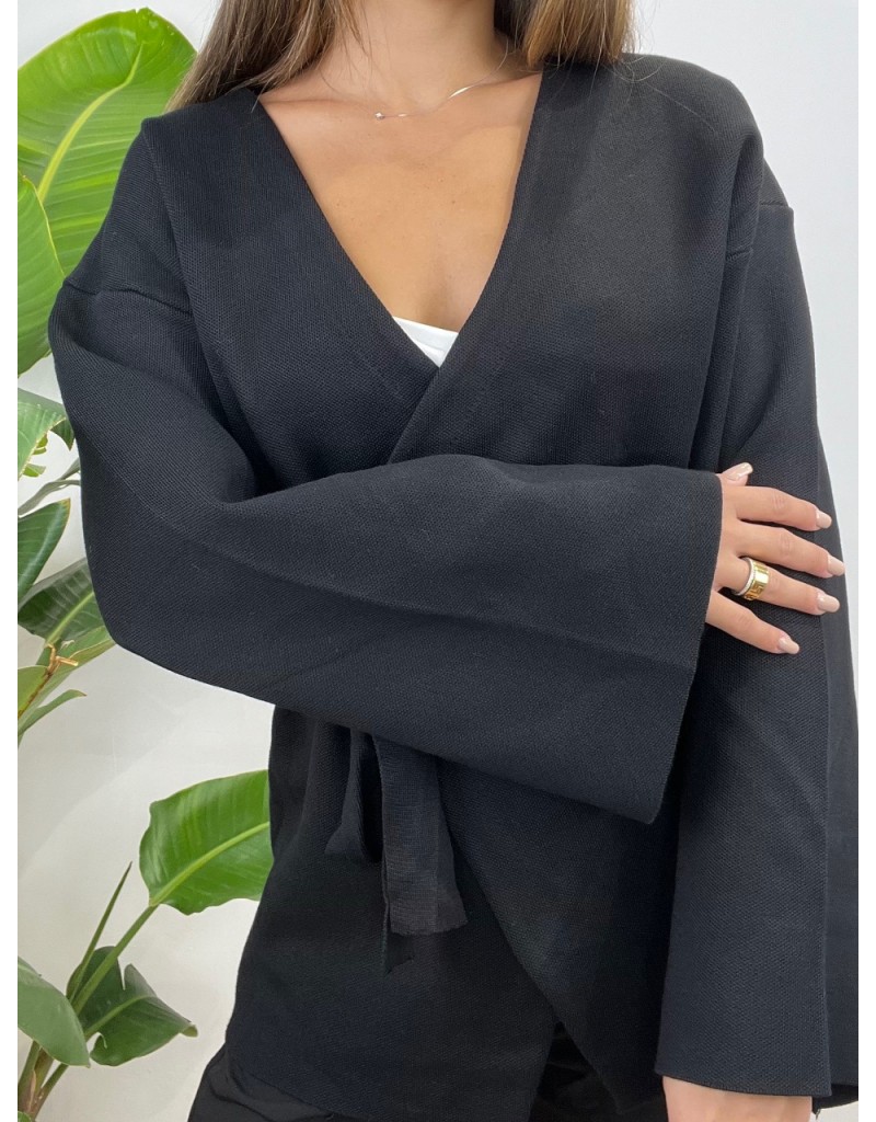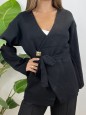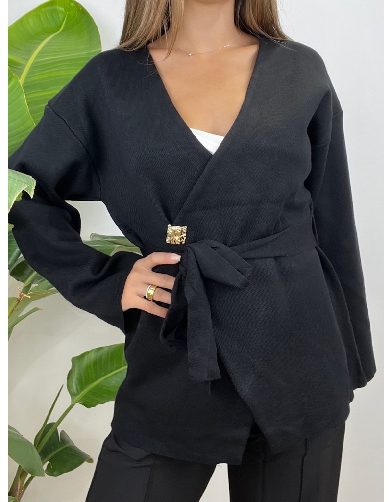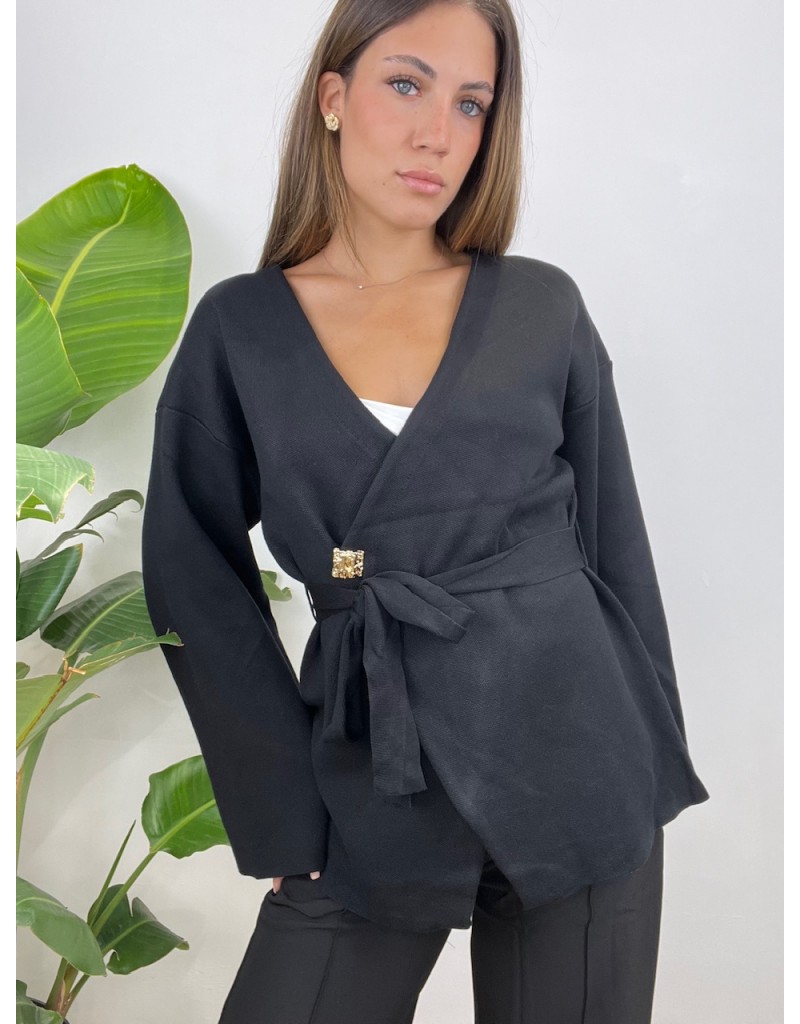 Cardigan con chiusura ad incrocio e accessorio metallico.