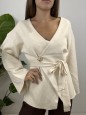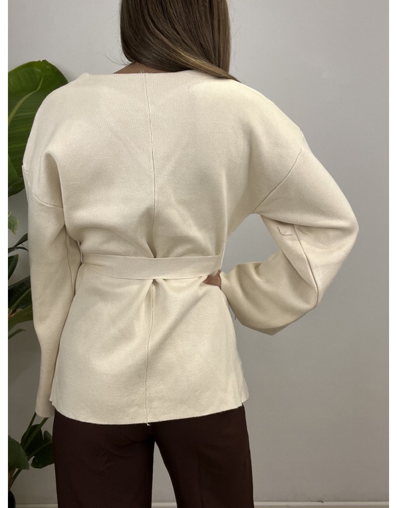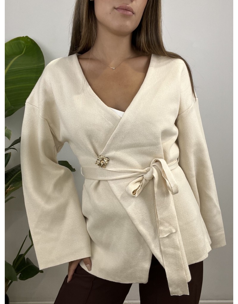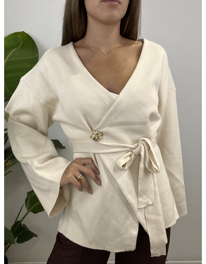 Cardigan con chiusura ad incrocio e accessorio metallico.