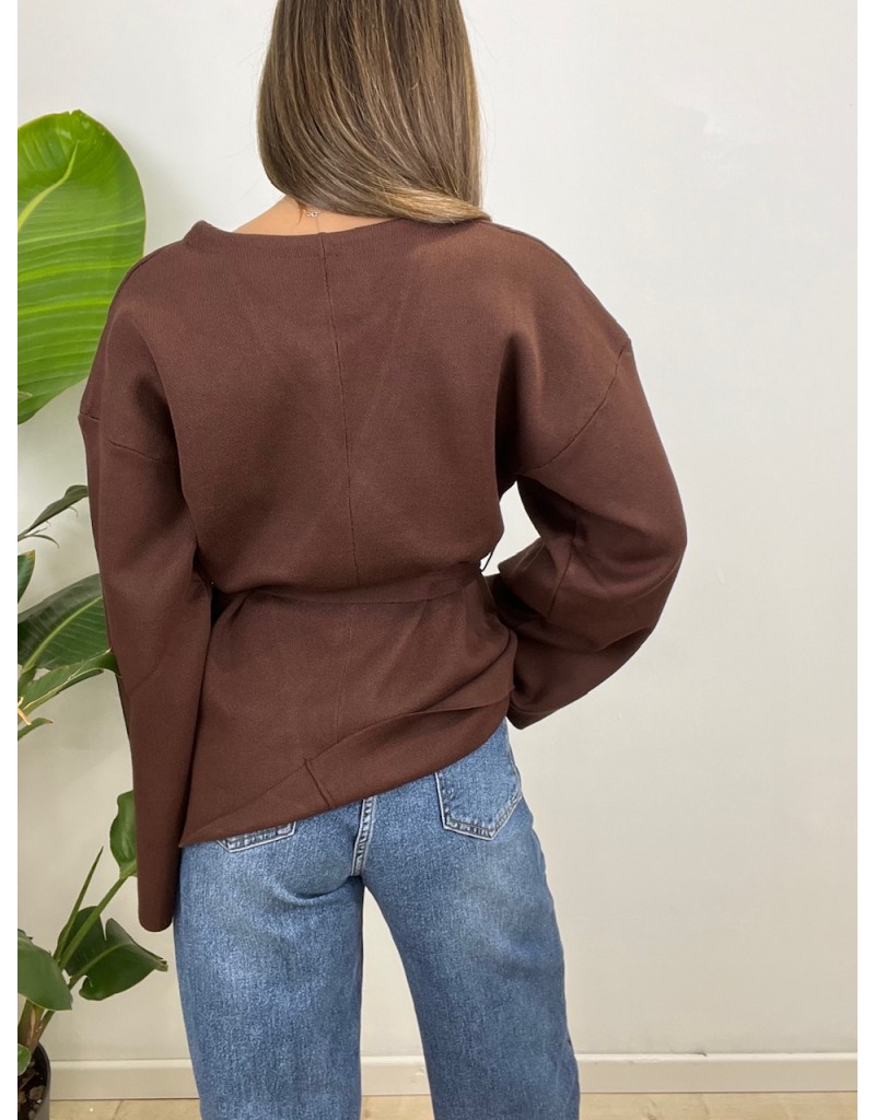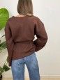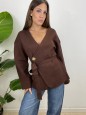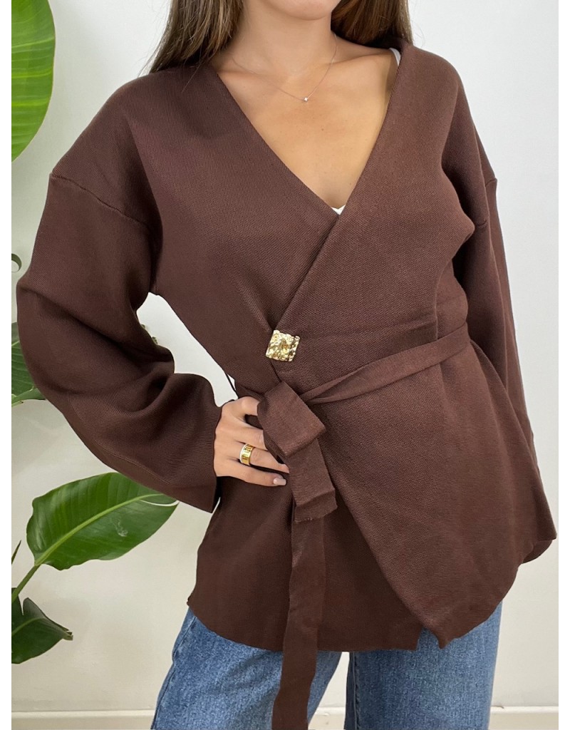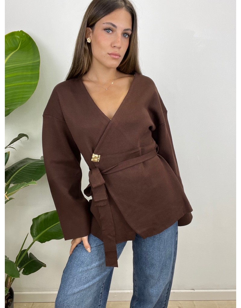 Cardigan con chiusura ad incrocio e accessorio metallico.