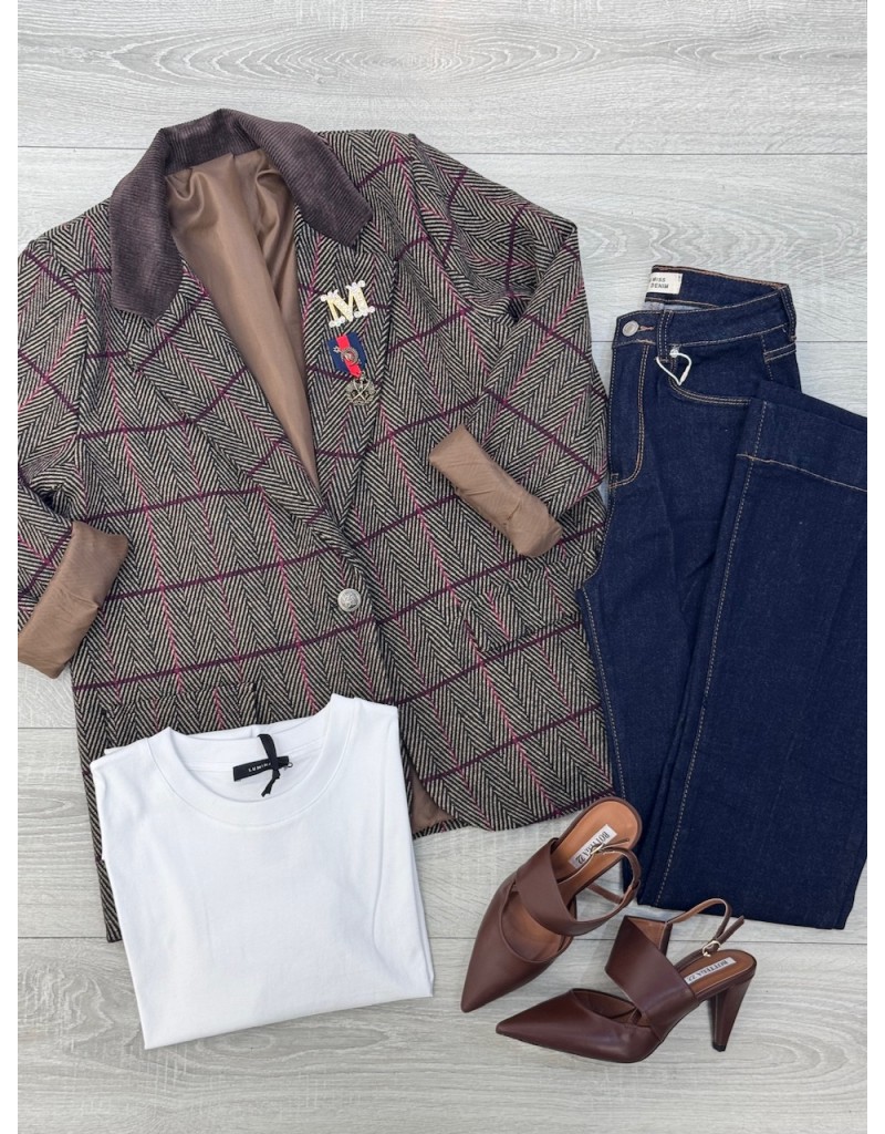 Blazer a fantasia con spilla e collo in velluto millerighe.