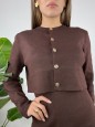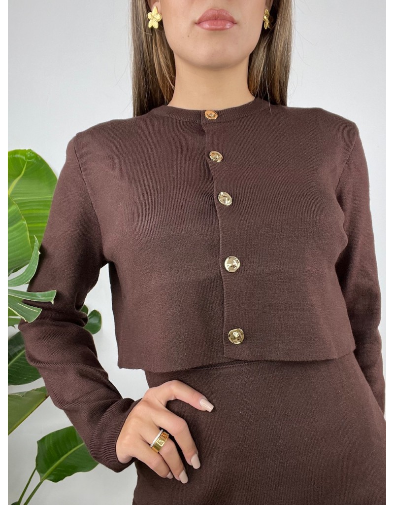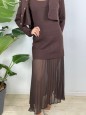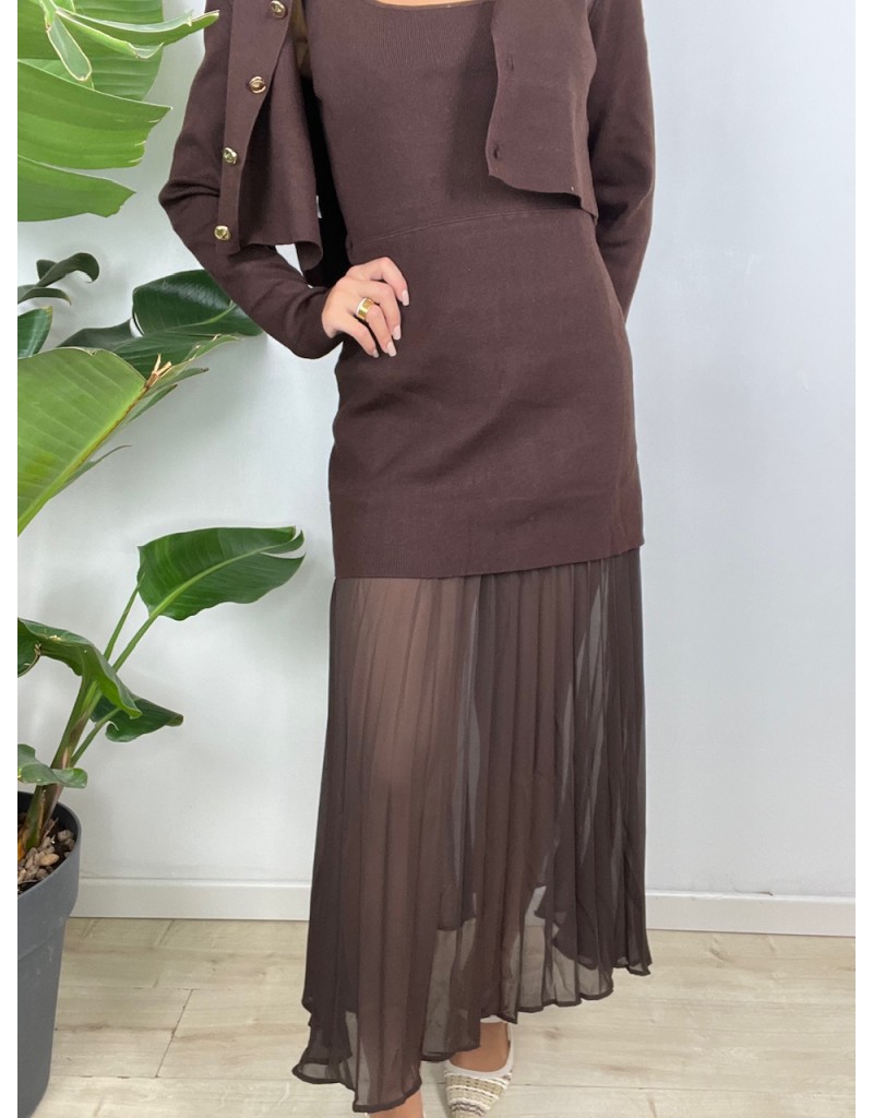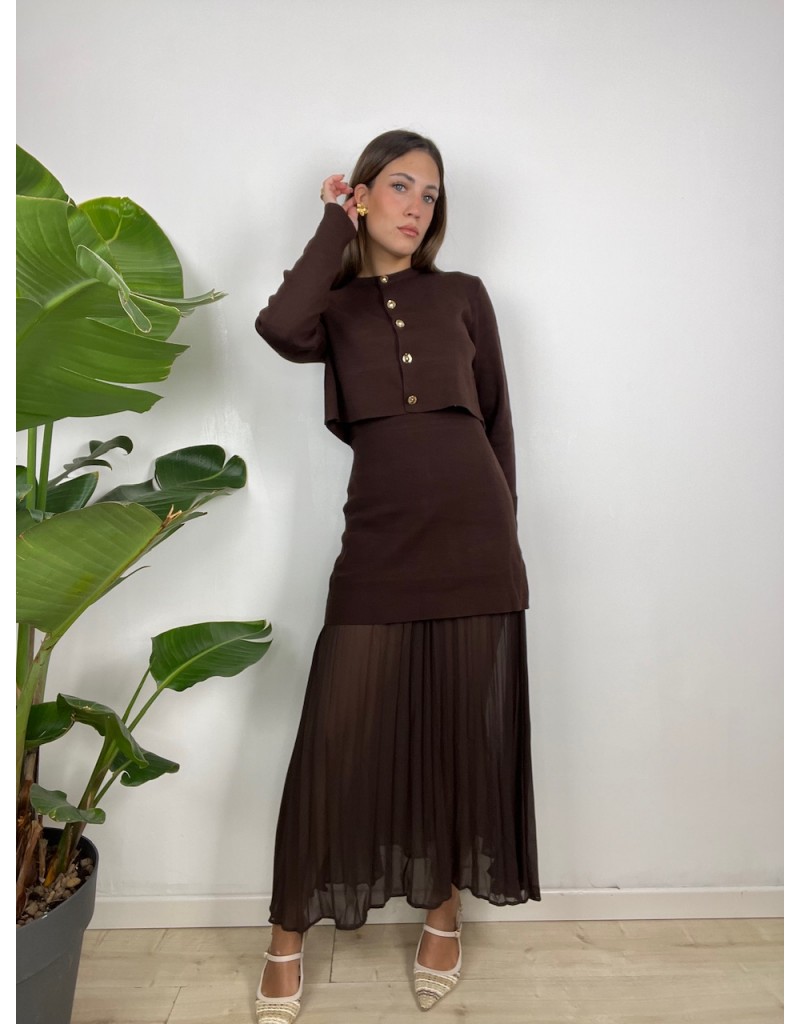 Completo in lanetta rasata, composto da cardigan e vestito lungo con parte inferiore in raso plissè.