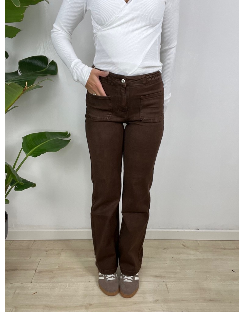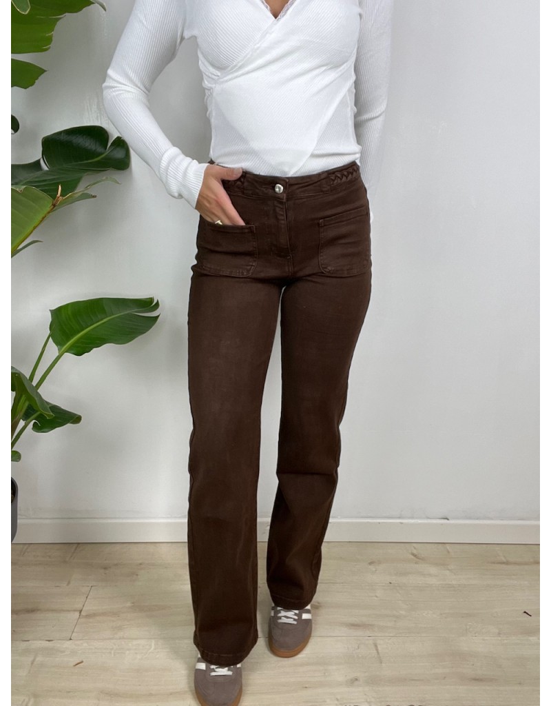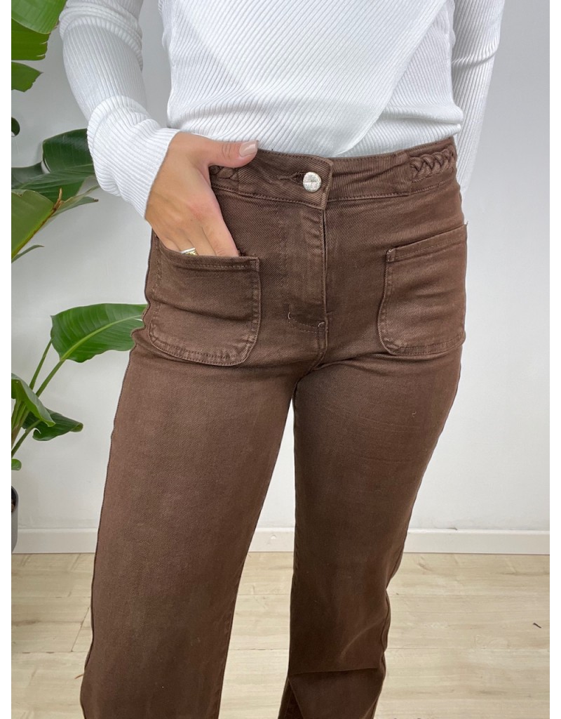 Jeans in tessuto elastico modello vita alta con cinta a cordicina intrecciata.