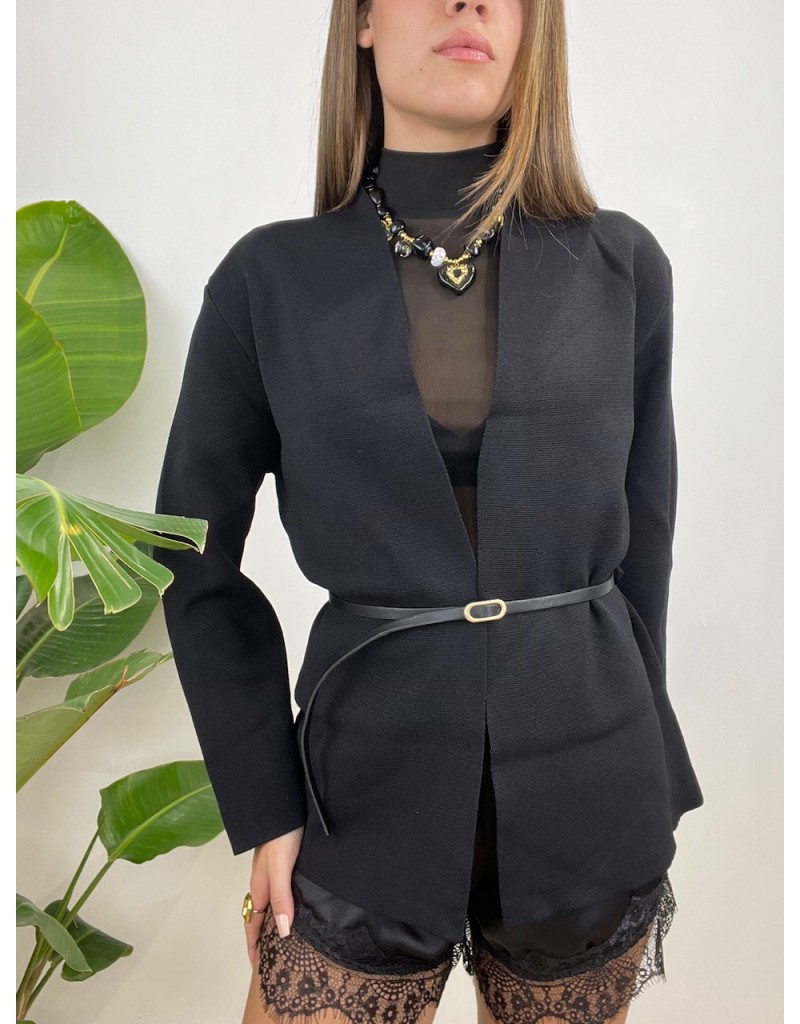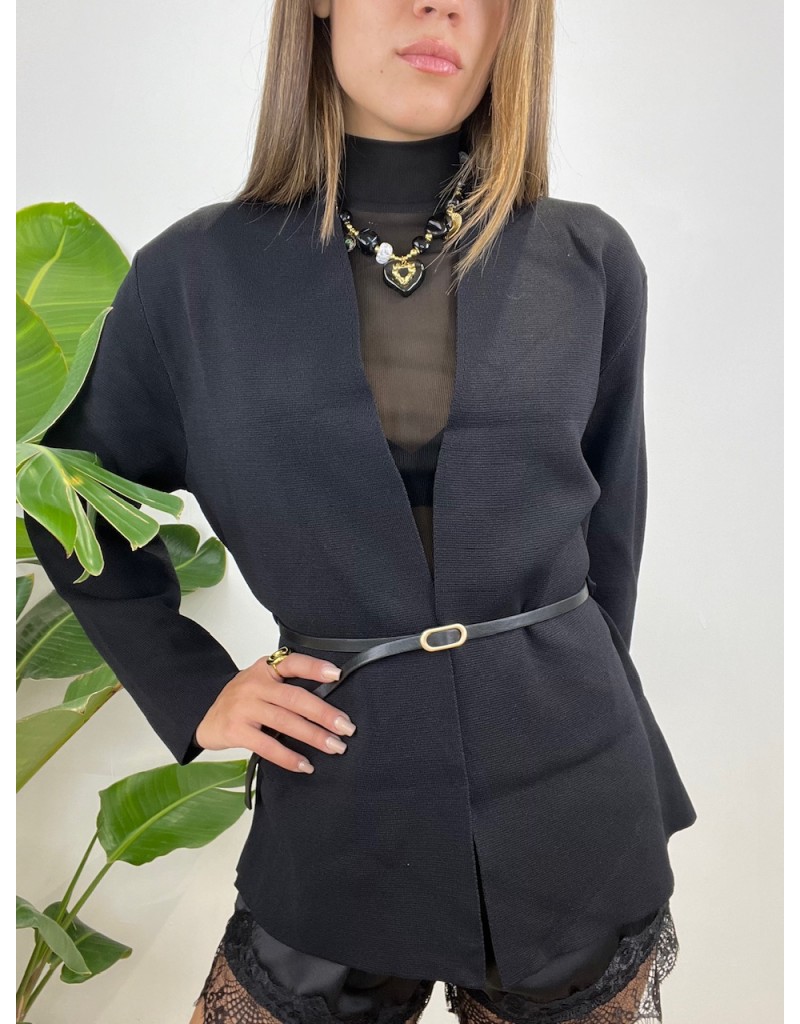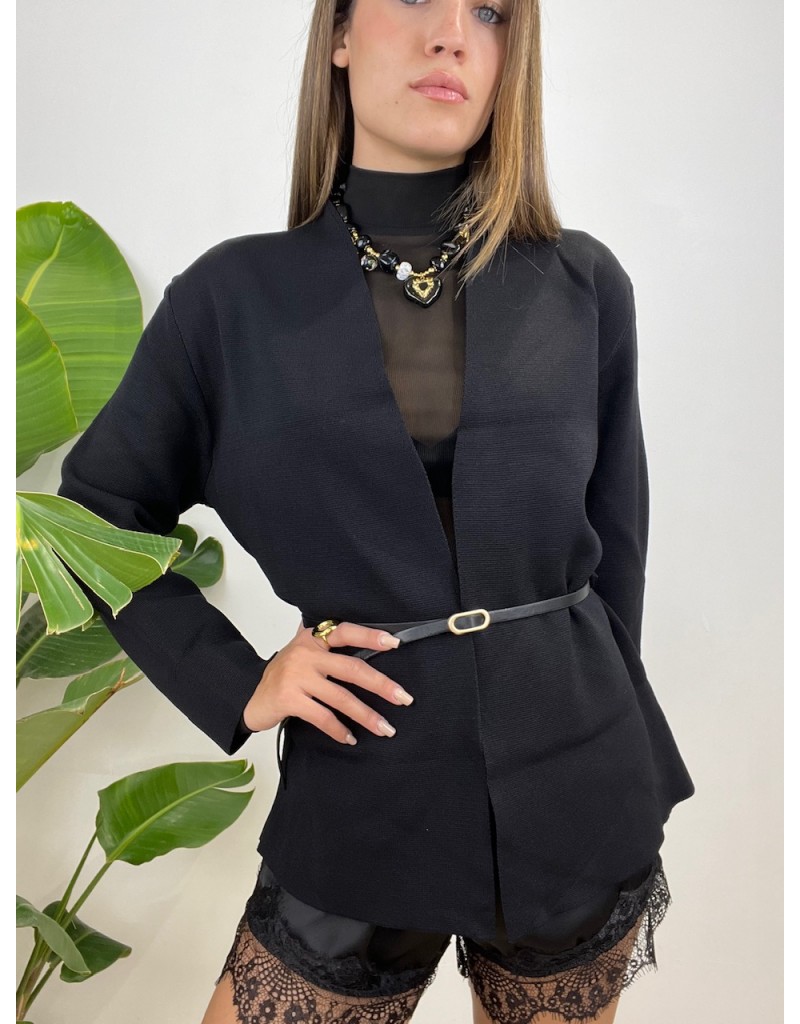 Cardigan con cinturino e senza bottoni.