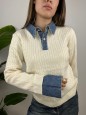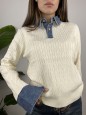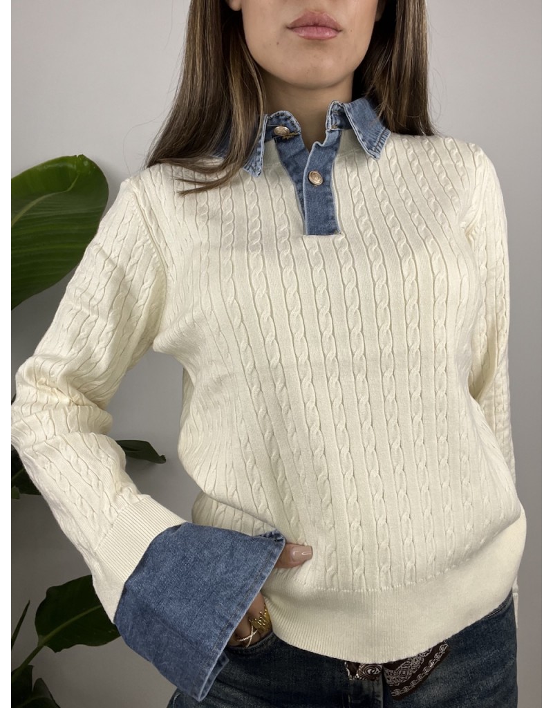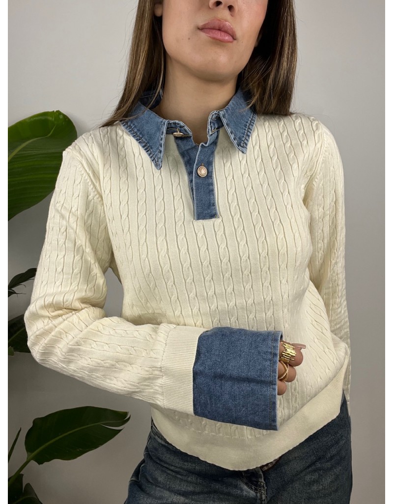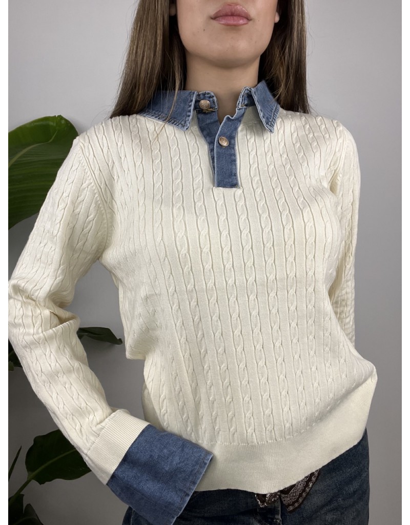Pullover modello polo con colletto denim e treccine.
