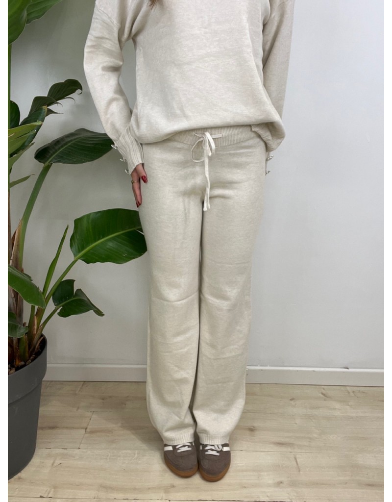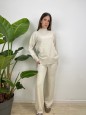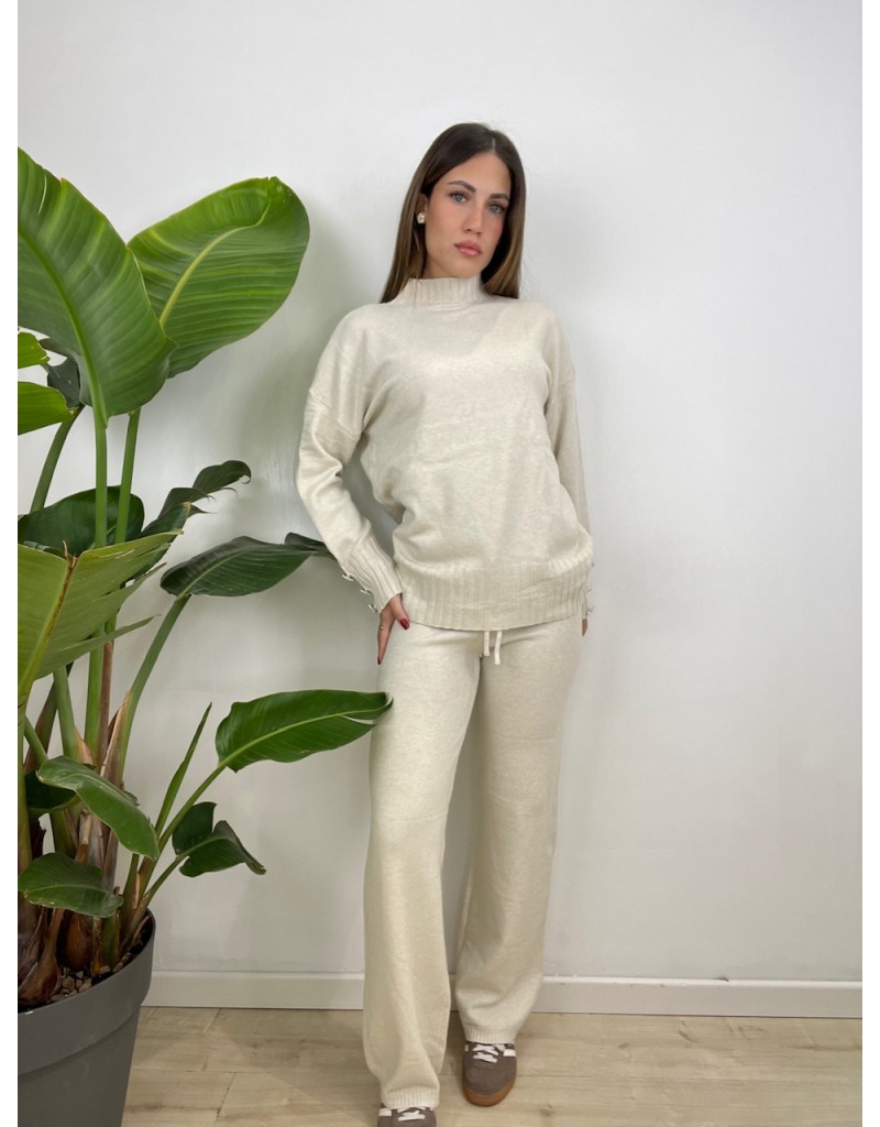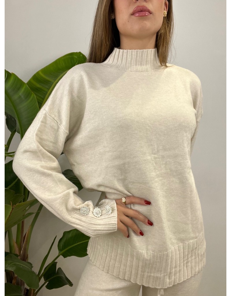 Coordinato in maglio con bottoni gioiello ai polsi.