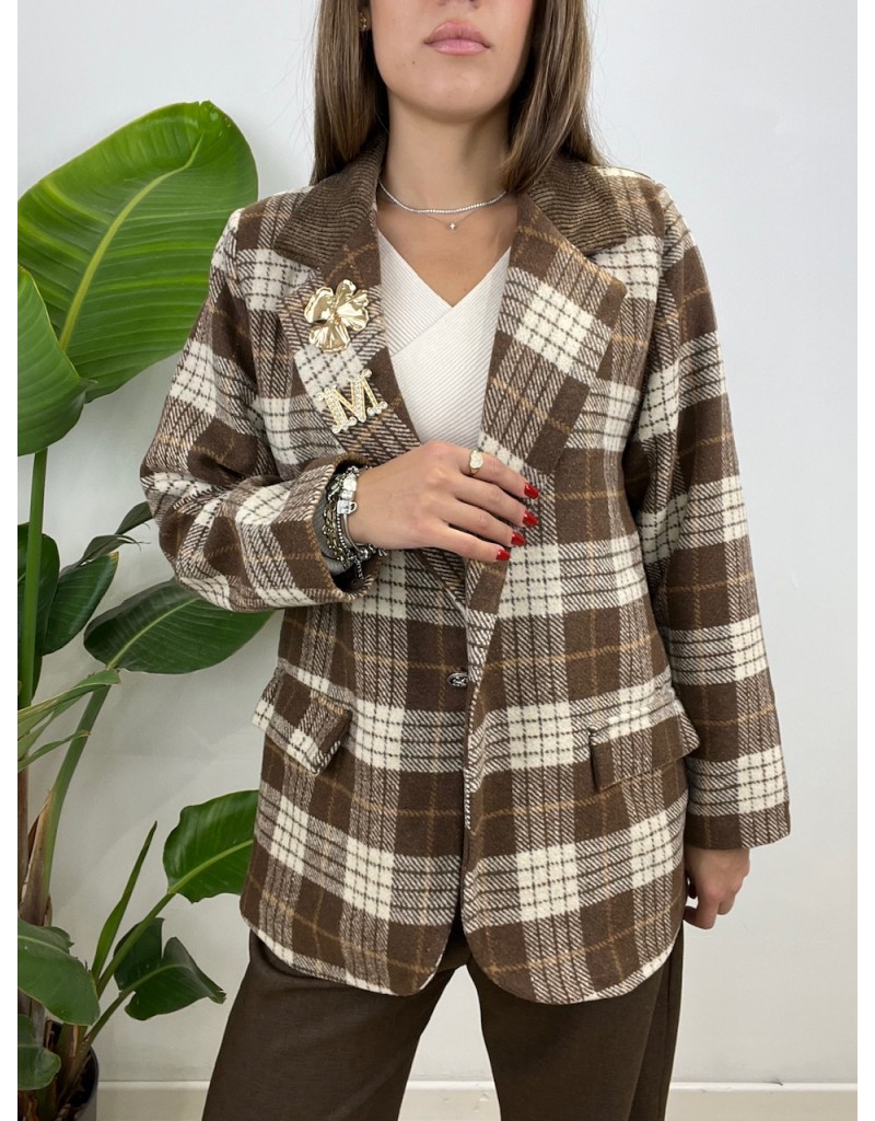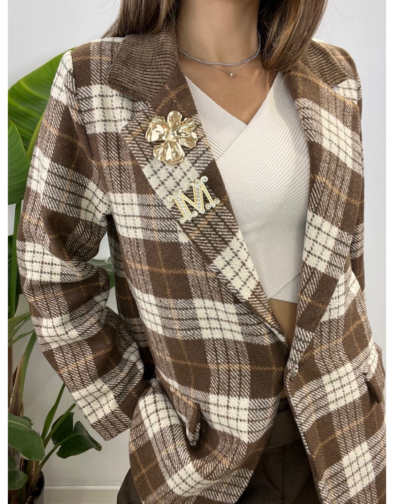 Blazer a fantasia con spilla e collo in velluto millerighe.