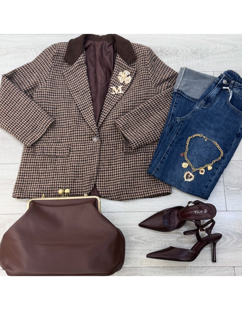 Blazer a fantasia con spilla e collo in velluto millerighe.