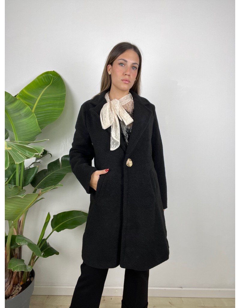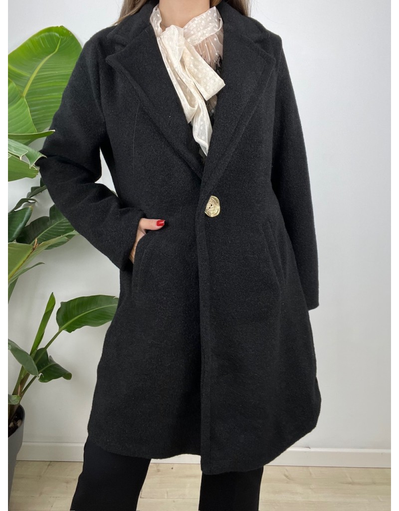 Cappotto lunghezza media e vestibilità over con bottone particolare.