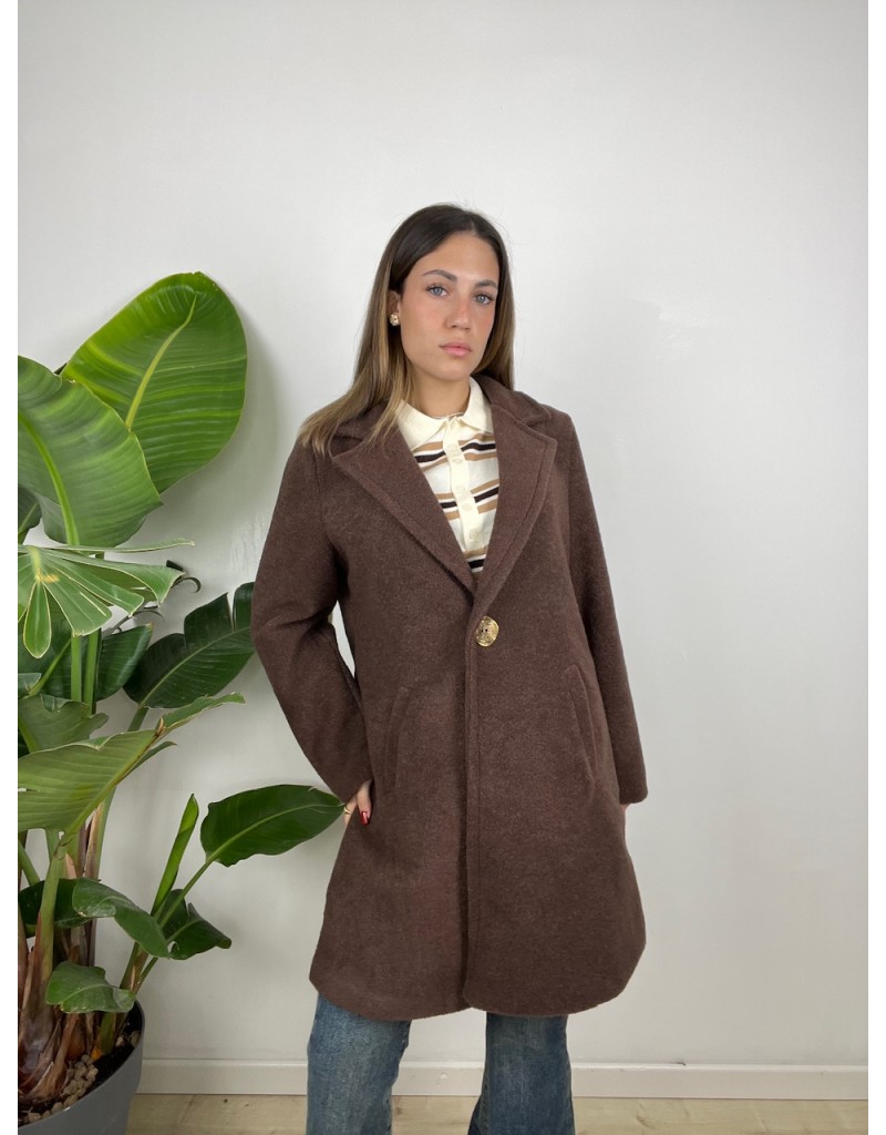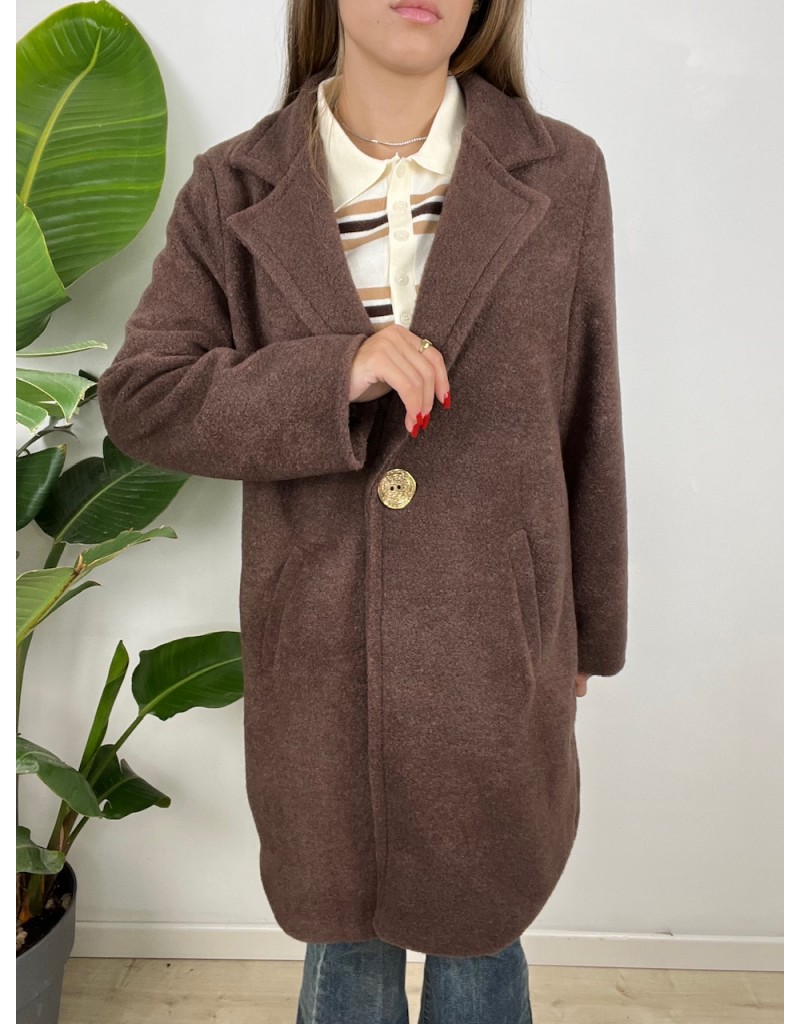 Cappotto lunghezza media e vestibilità over con bottone particolare.