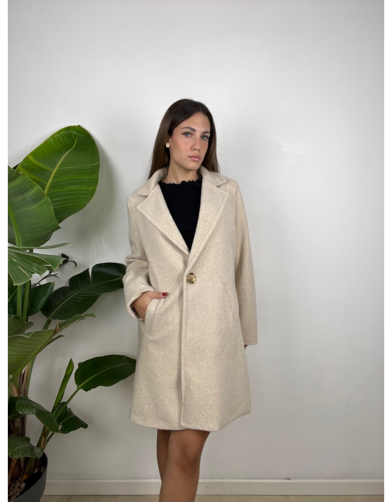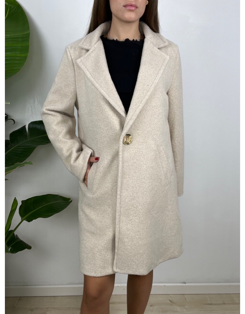 Cappotto lunghezza media e vestibilità over con bottone particolare.