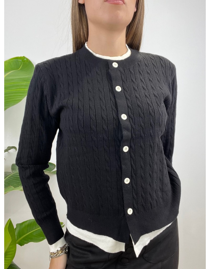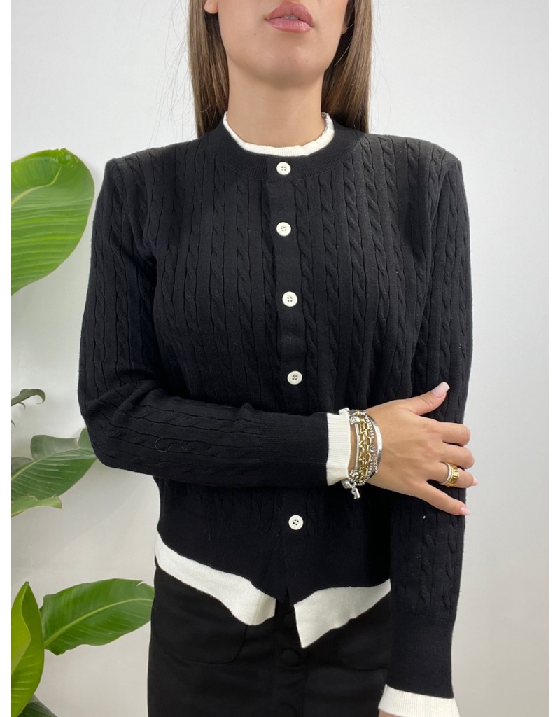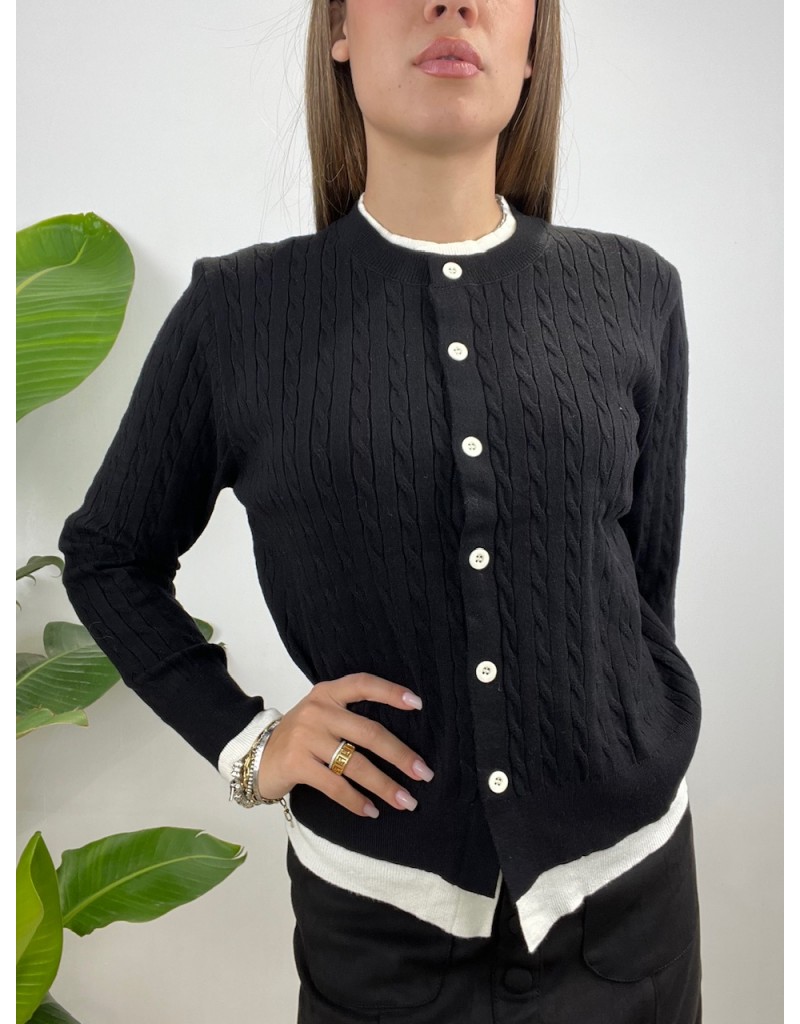 Cardigan con treccine e riporto in tessuto.