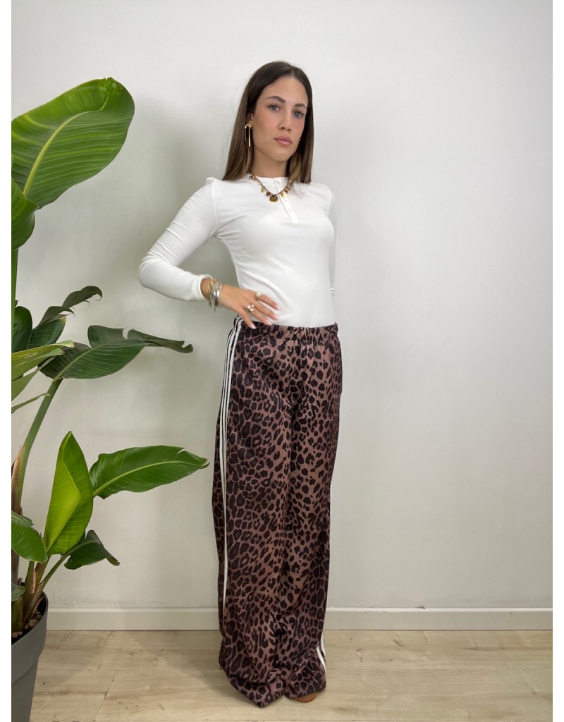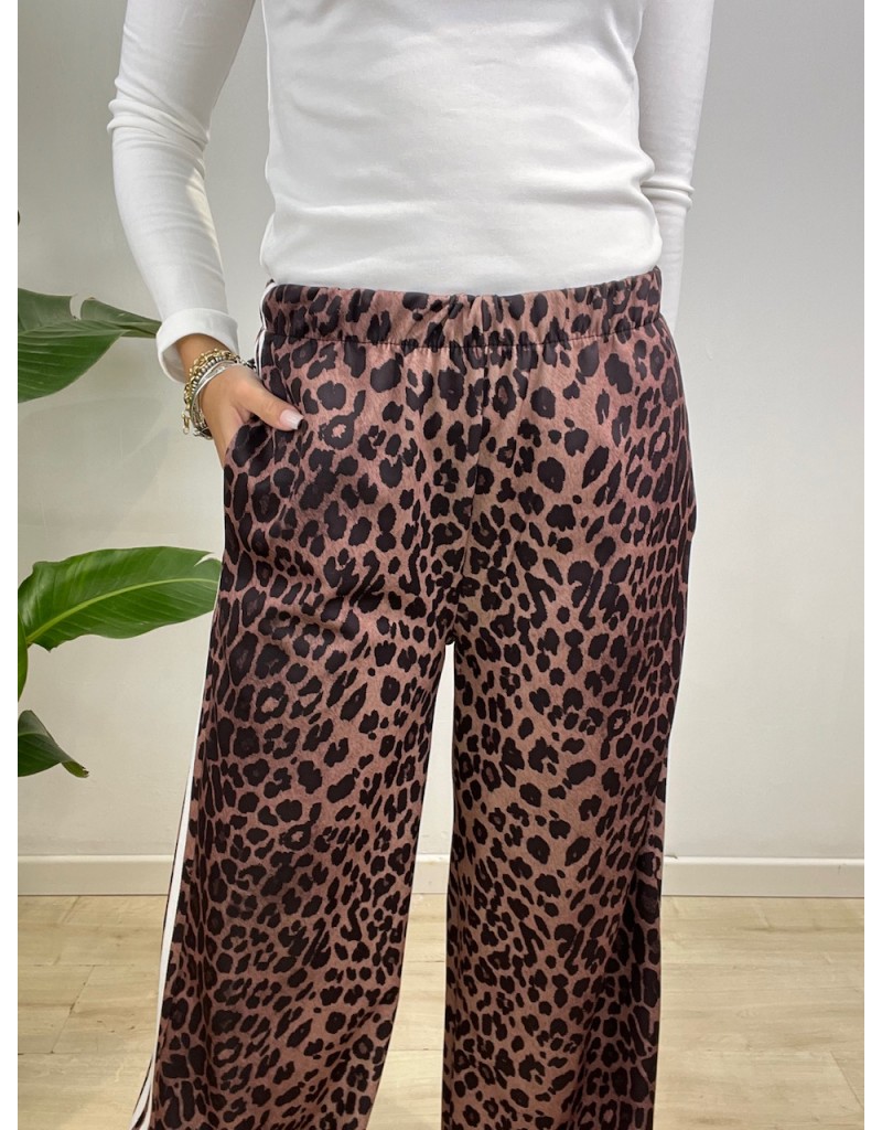 Pantaloni in fantasia maculata con strisce laterali, modello largo.