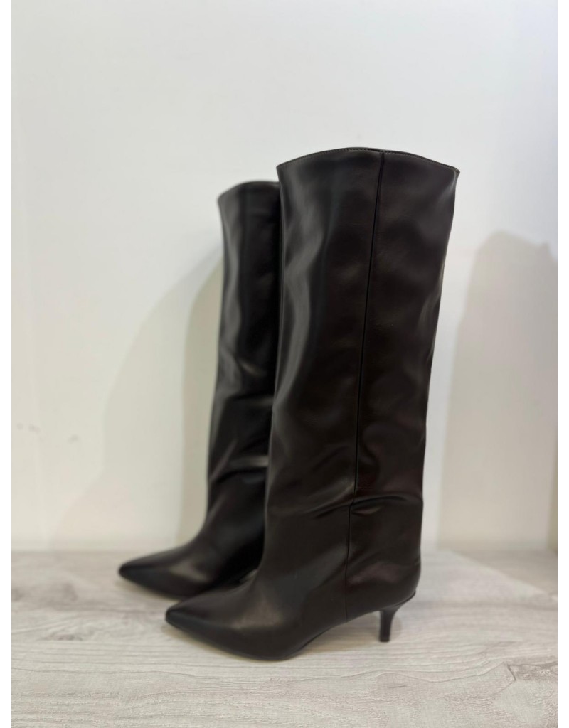 Stivale in eco pelle. Gambale alto e largo .Facile da indossare. Tacco kitten e finitura a punta.