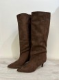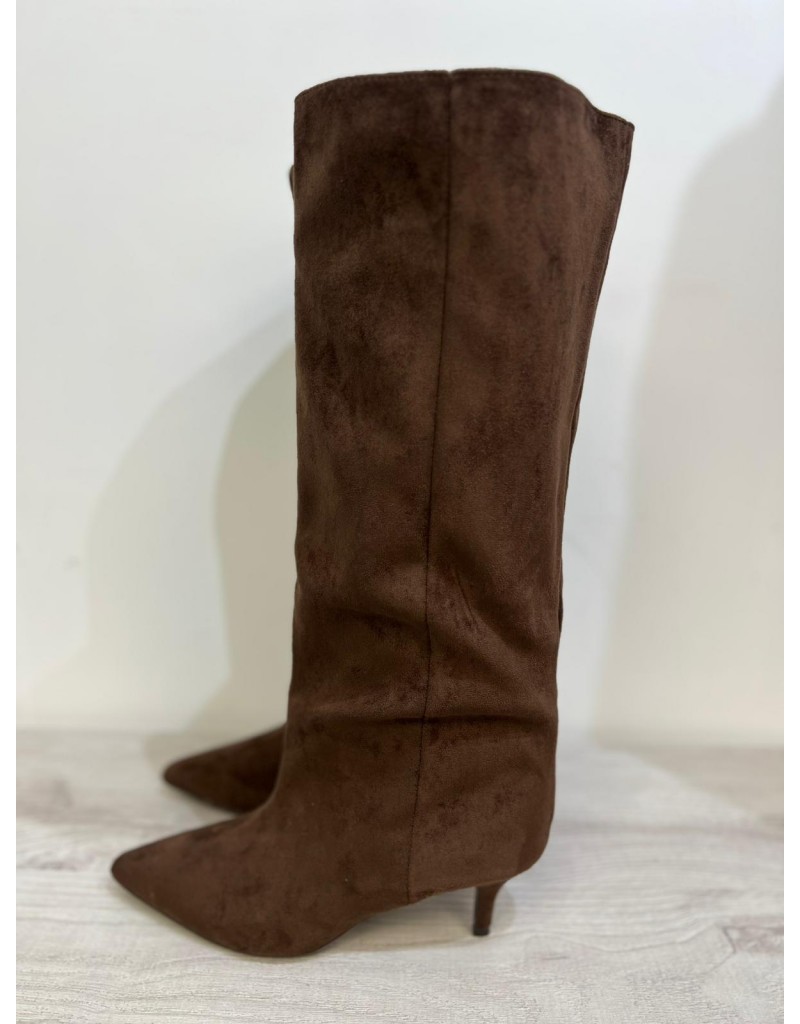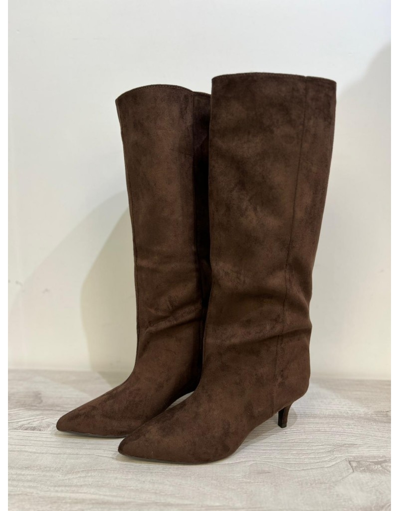Stivale in eco pelle scamosciata . Gambale alto e largo .Facile da indossare. Tacco kitten e finitura a punta.