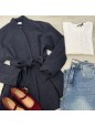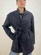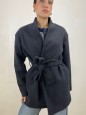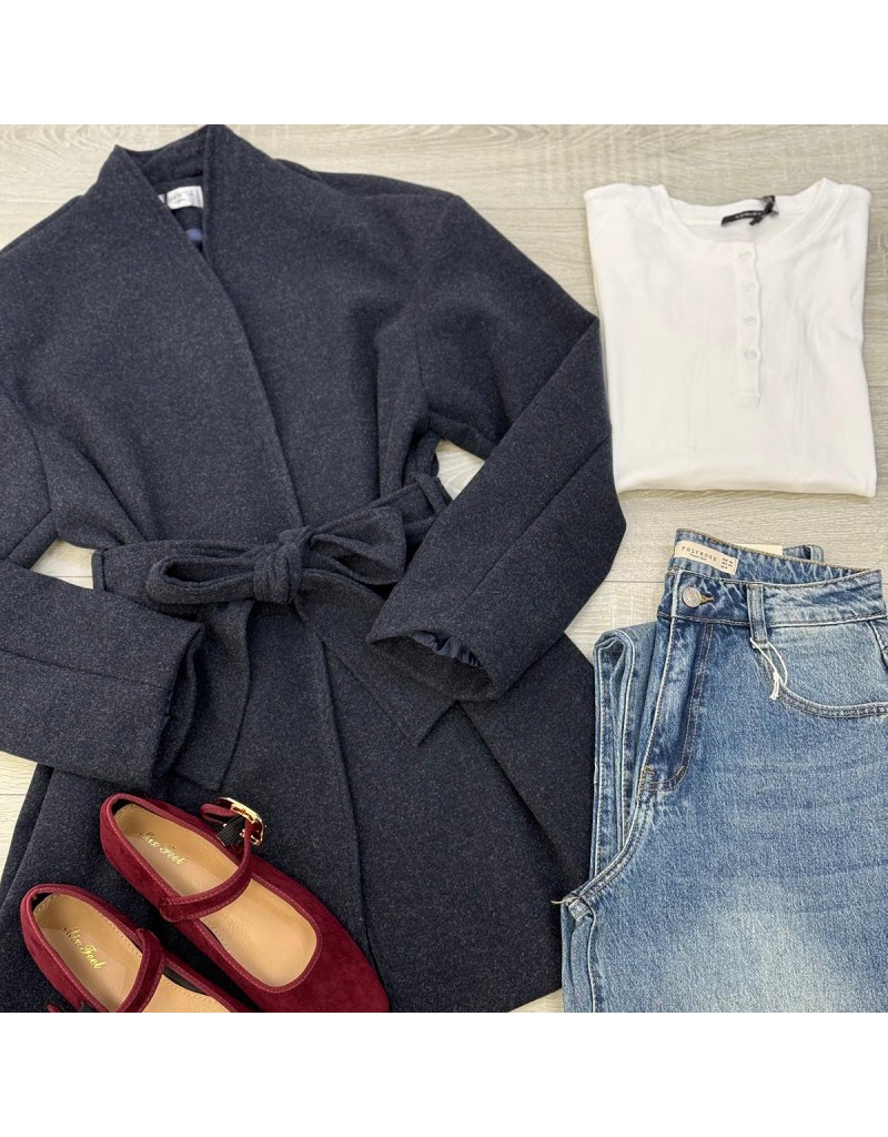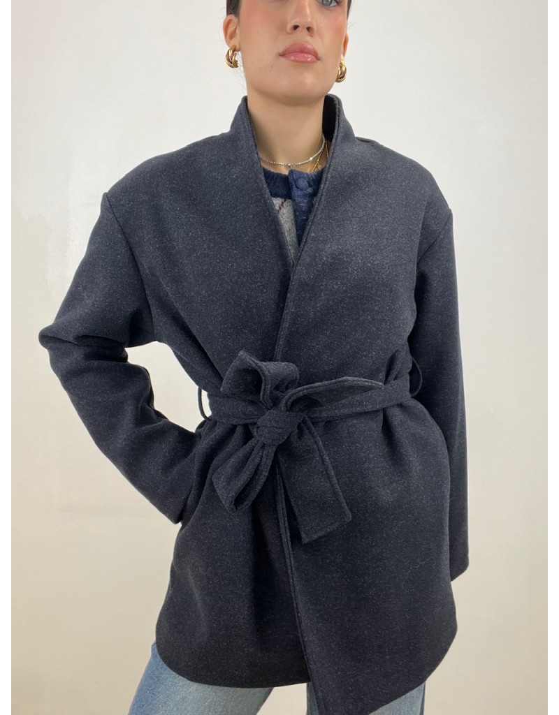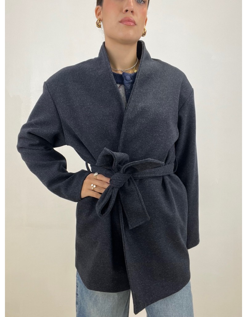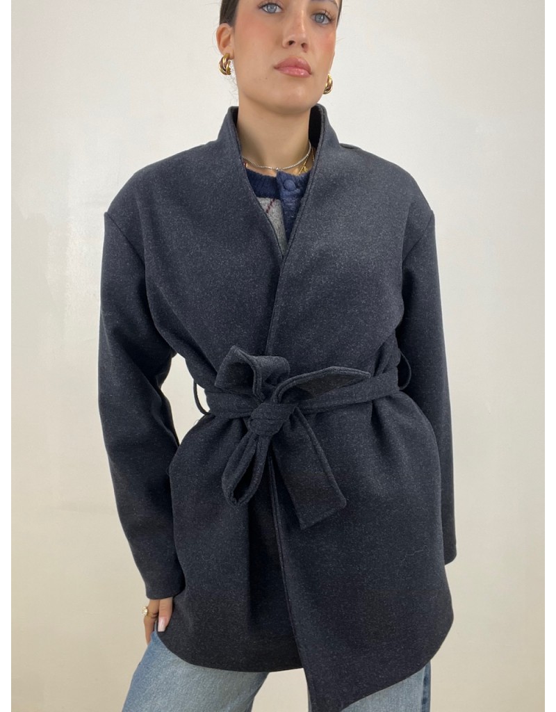 Cappotto modello midi con chiusura a cintura.