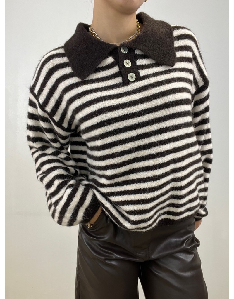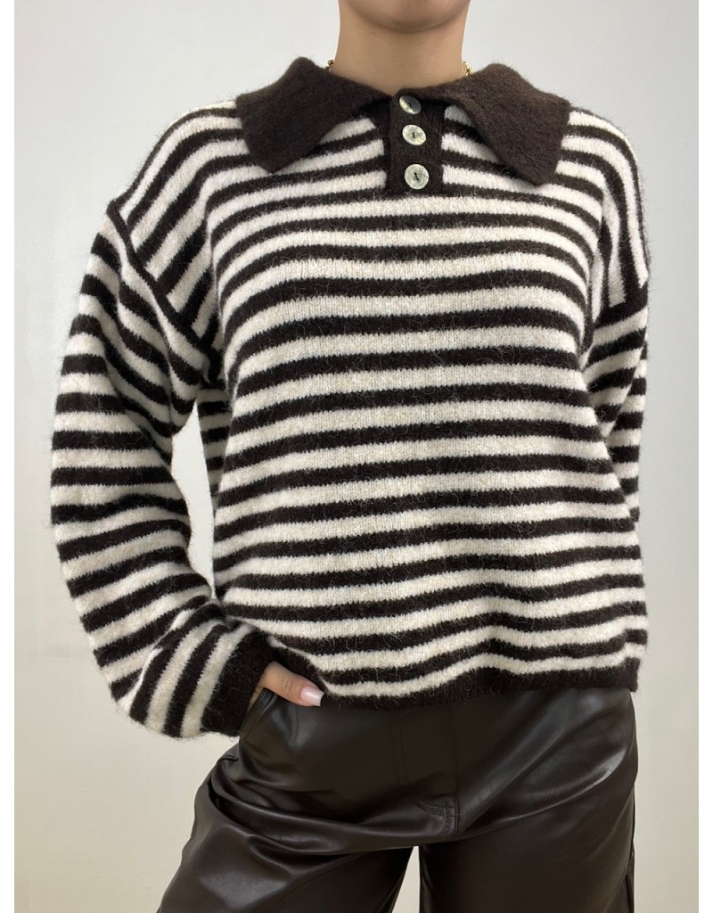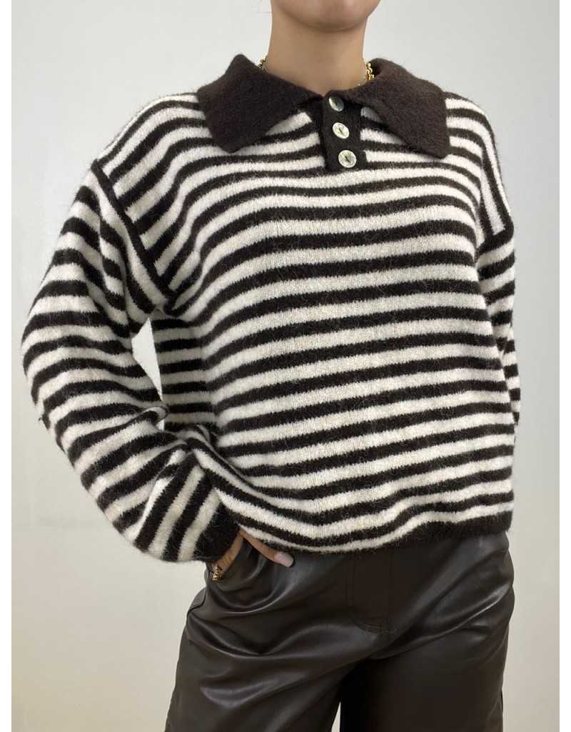 Pullover modello polo a righe in tessuto morbido e caldo.