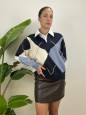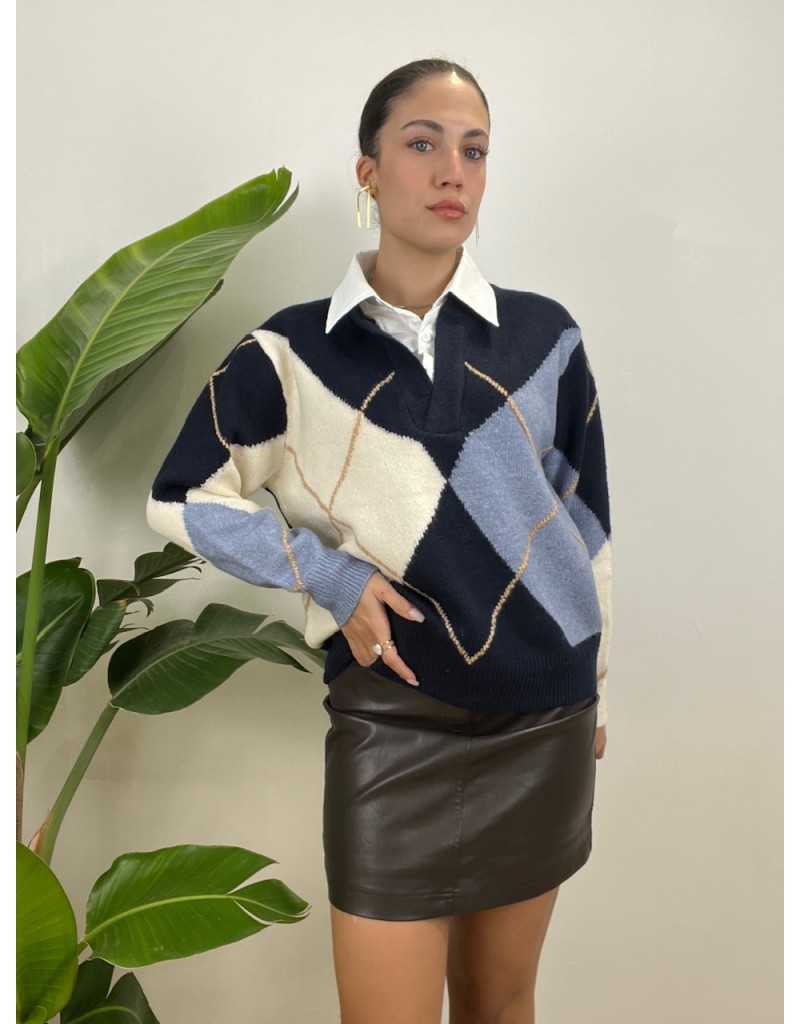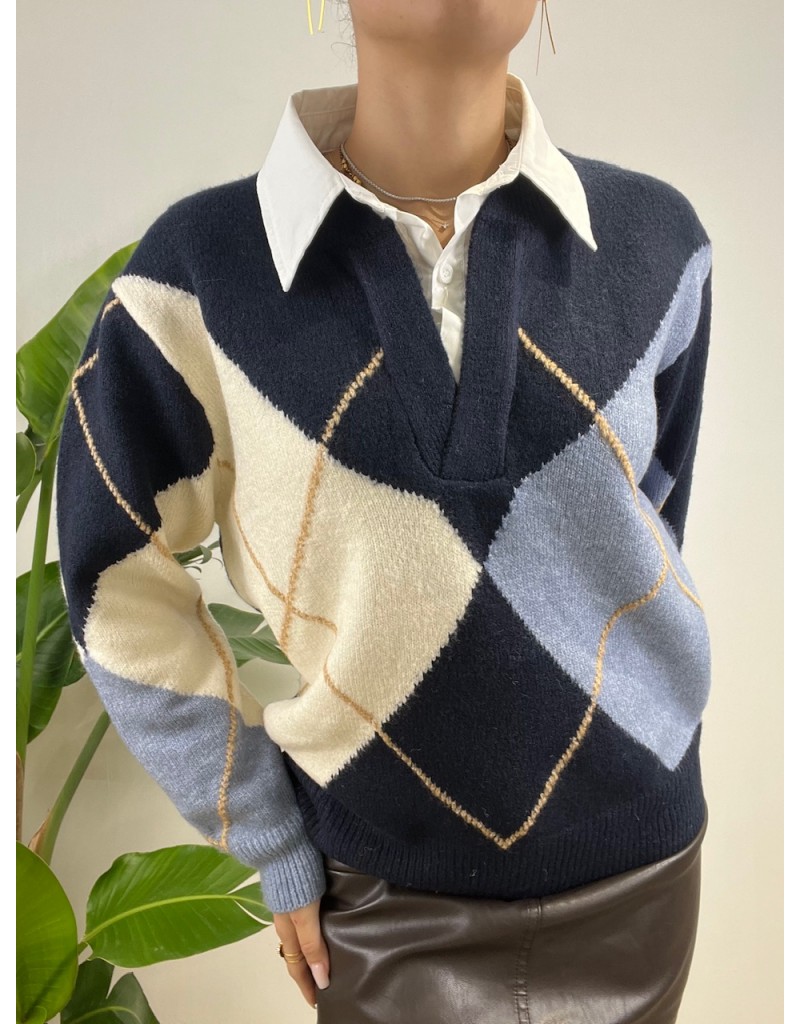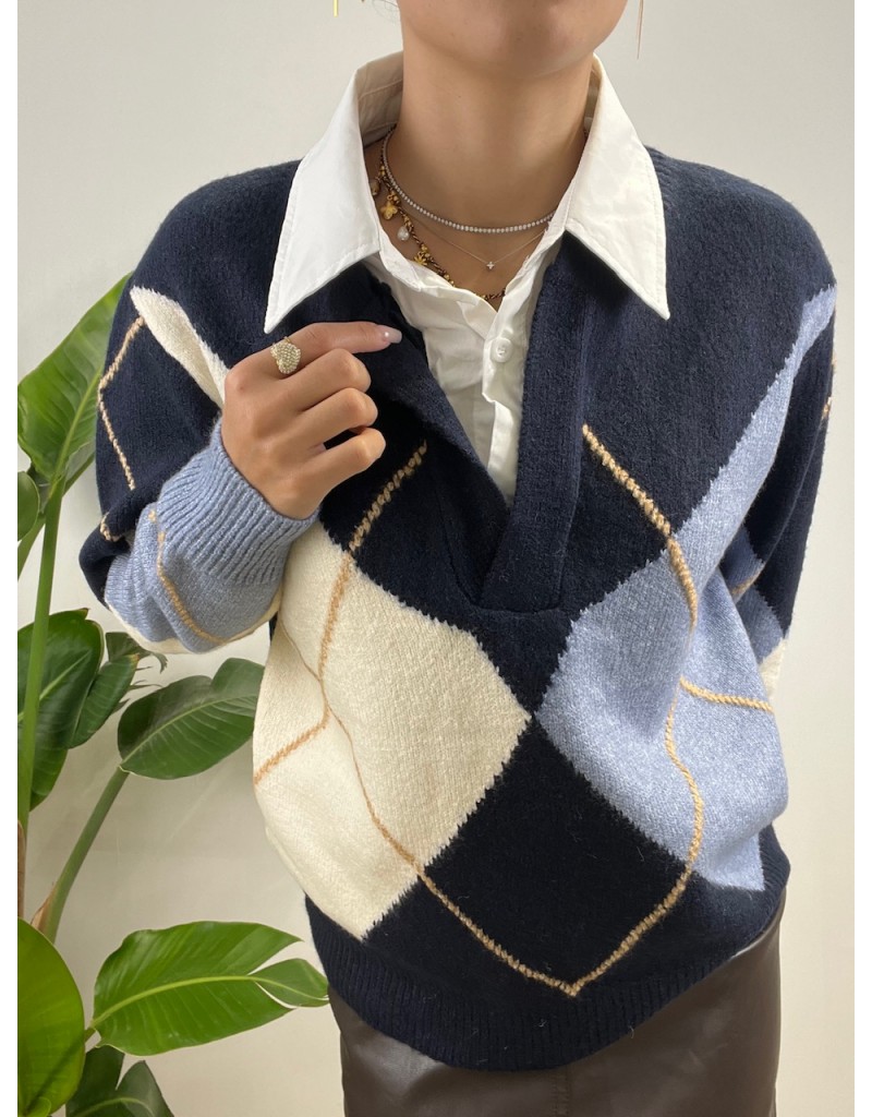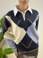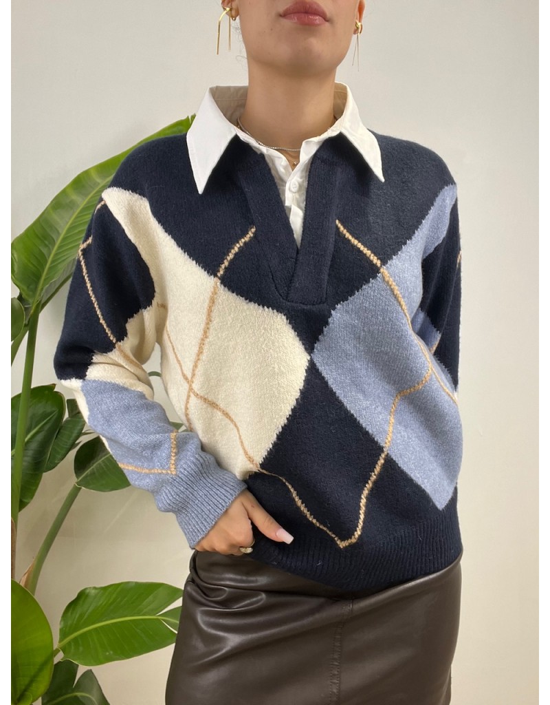 Pullover con collo camicia e scollo a V, fantasia a rombi.