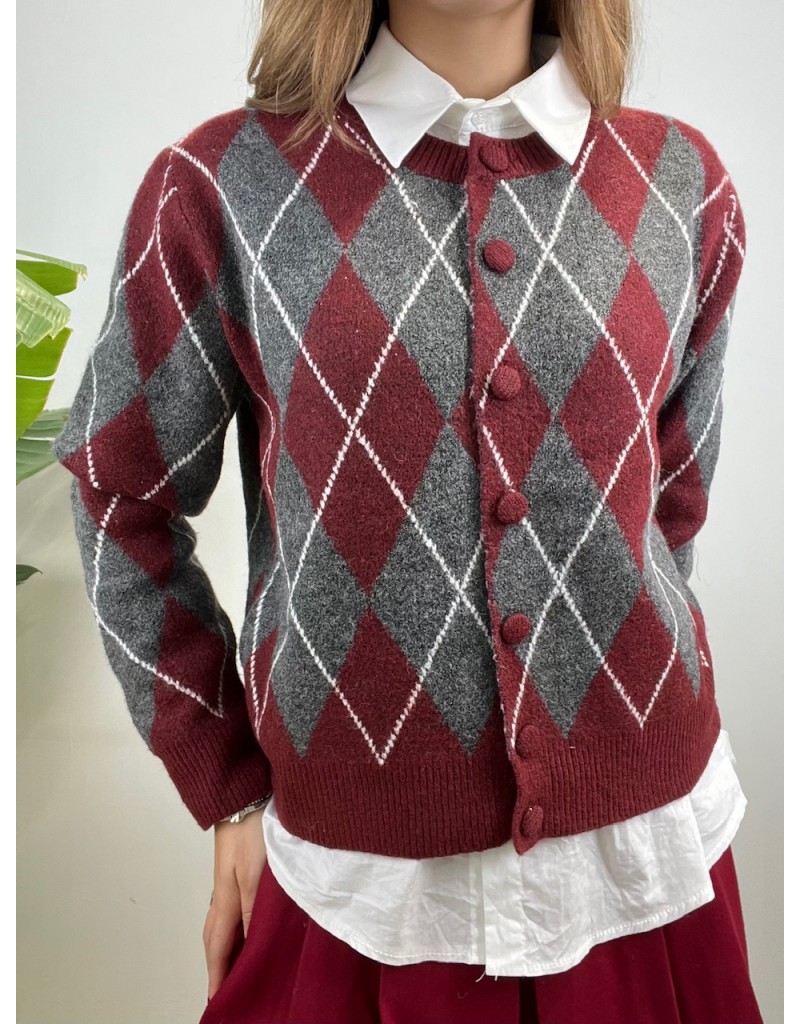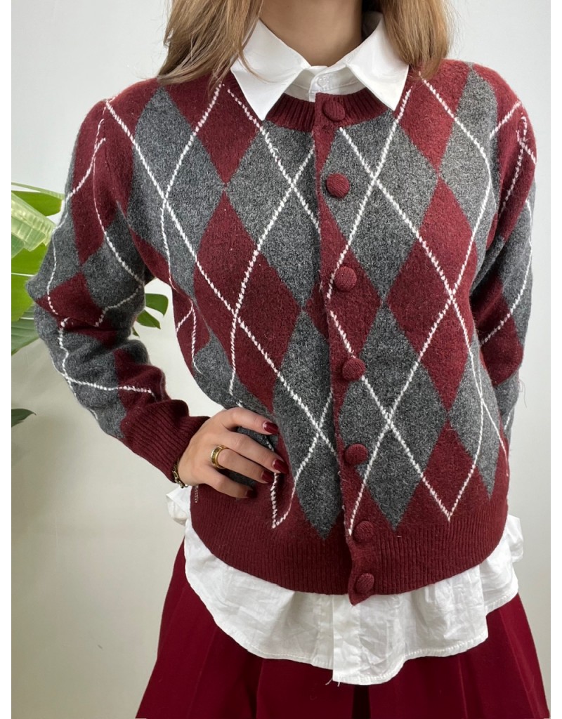 Cardigan in fantasia rombi modello girocollo.
