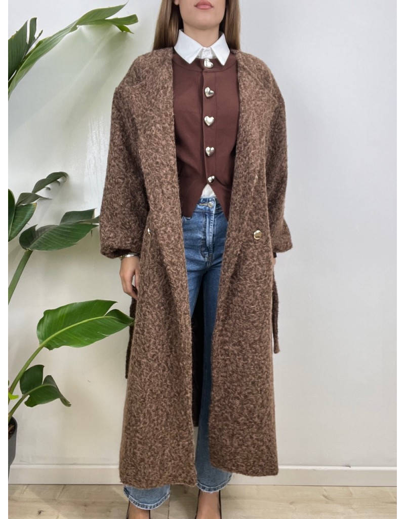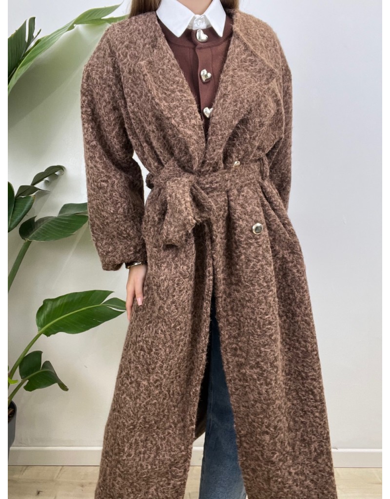 Cappotto lungo con cintura e chiusura bottoni. Polsini in maglia.