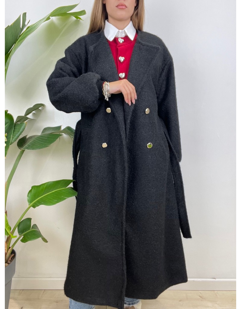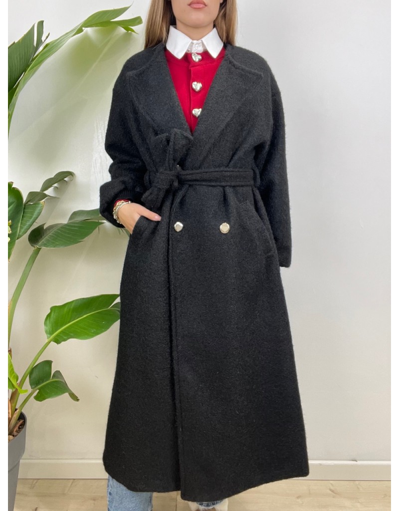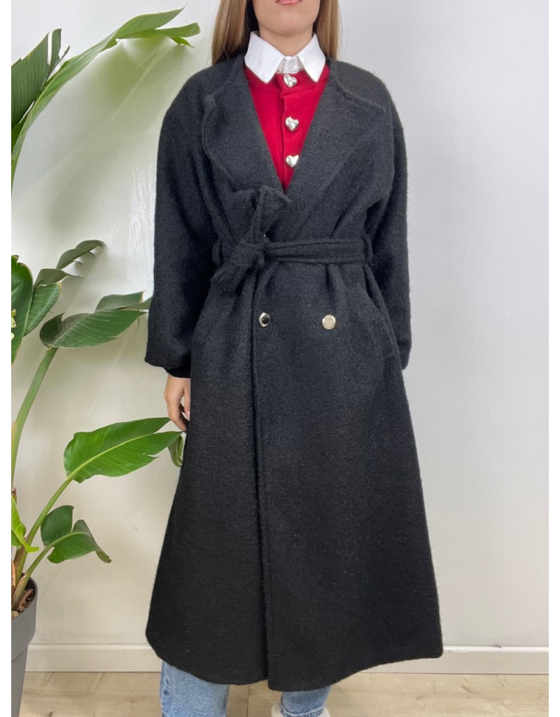 Cappotto lungo con cintura e chiusura bottoni. Polsini in maglia.