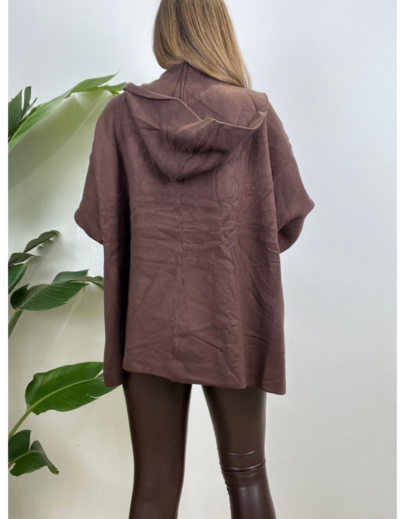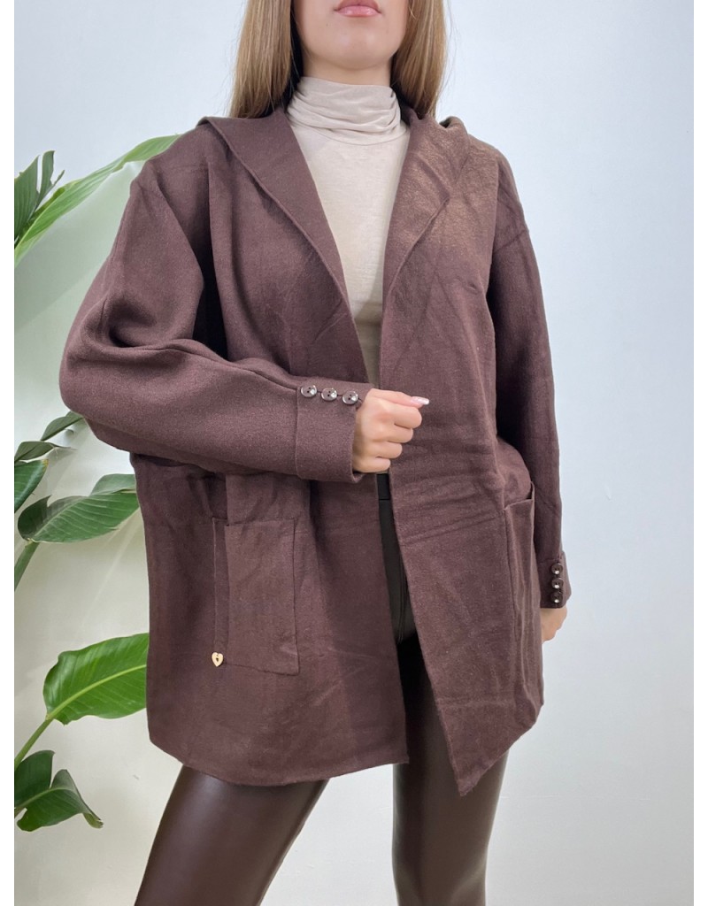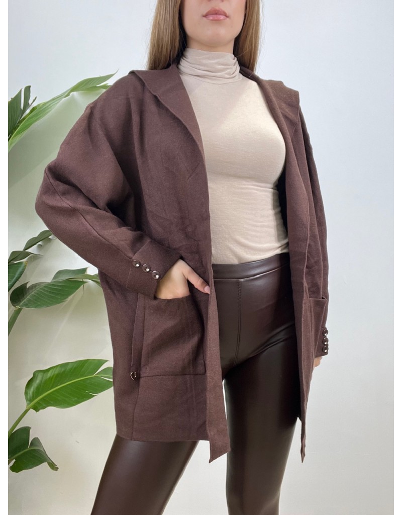 Maxi cardigan con cappuccio e tasche, senza bottoni.