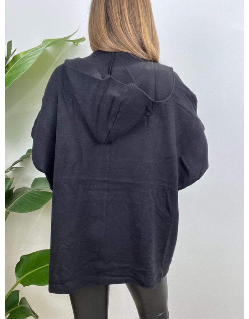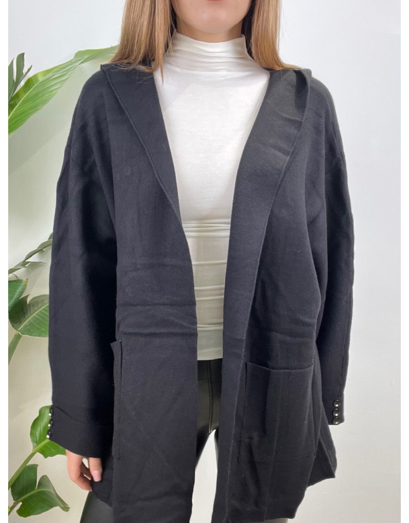 Maxi cardigan con cappuccio e tasche, senza bottoni.